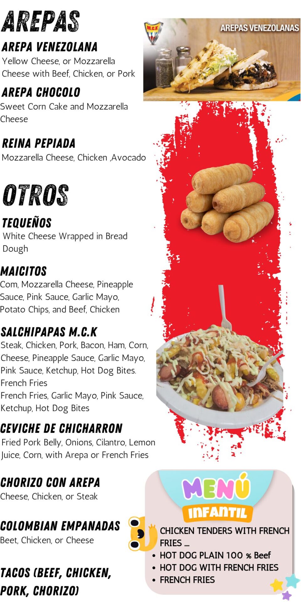 Autentico sabor latino sobre ruedasDisfruta de lo mejor de nuestra tierra en cada bocado de arepas, sandwiches, burgers, maicitos, empanadas y más.